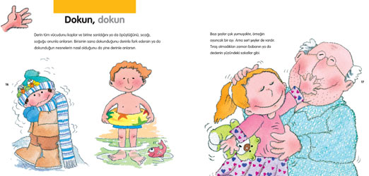 Duyularımız: Neleri görürüz, neler yiyip tadını alırız, suyun sıcak soğuk olduğunu algılarız. Duyularla dünyayı nasıl kesfederiz. Kitabın sonunda anne babalara öneriler var.